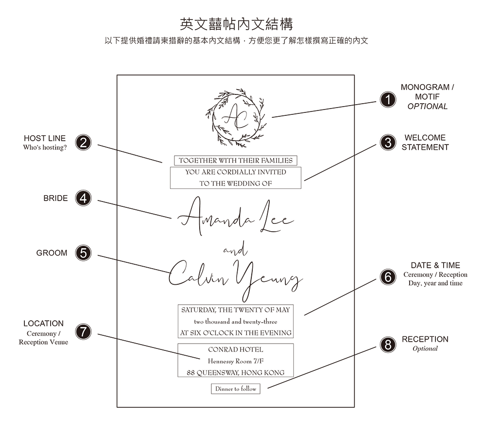 Whoever is hosting the wedding should be listed here. This can be the both parents, bride's parents, the groom's parents,bride and groom and bride and groom with families. See our English Wordings and Eliquette Examples.