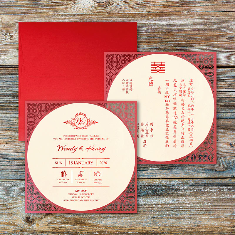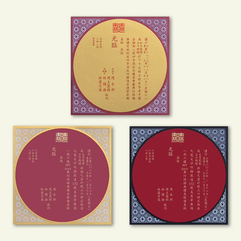 大部份請柬的內文、用紙、用色和字款可按照您的喜愛來改動,但須注意其中有部份選項須另加收費。