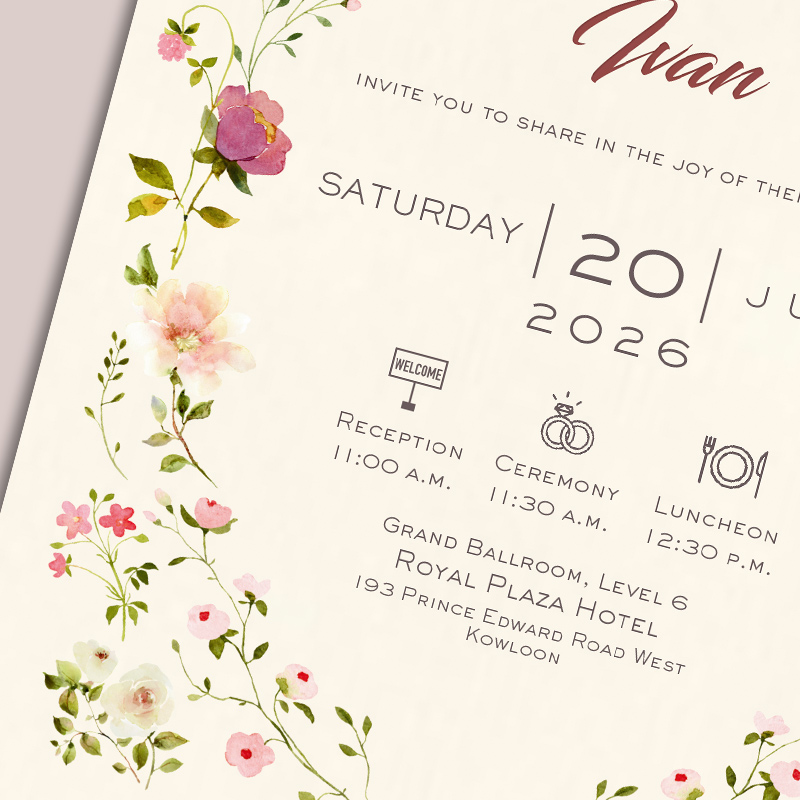 大部份請柬的內文、用紙、用色和字款可按照您的喜愛來改動,但須注意其中有部份選項須另加收費。
