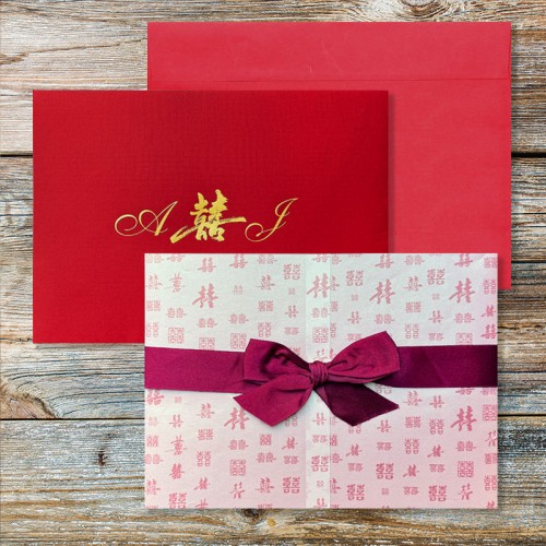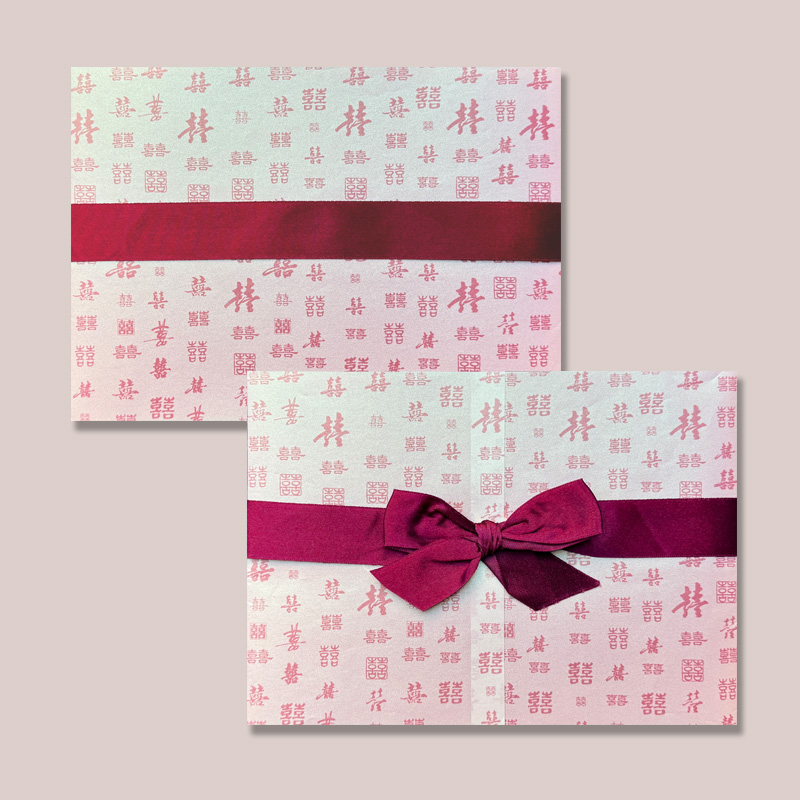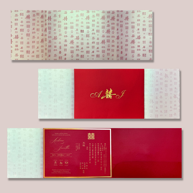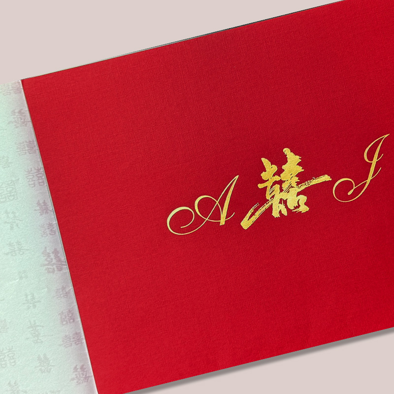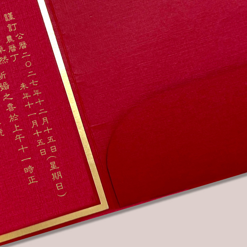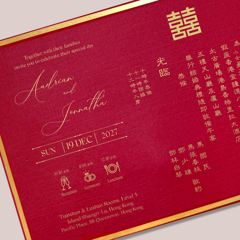 網站上請柬由內文、用紙、用色到字款都可以按照您的喜愛來改動。(如選擇雙面燙金壓印中英文,咭背可能會出現凹凸壓紋,可查詢內咭改為對裱加厚效果。)