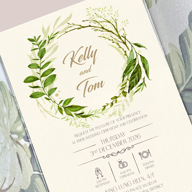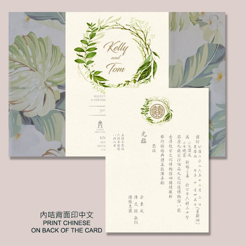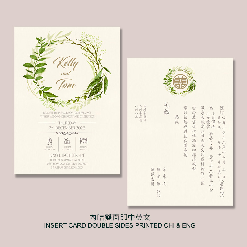 網站上請柬由內文、用紙、用色到字款都可以按照您的喜愛來改動。(如選擇雙面燙金壓印中英文,咭背可能會出現凹凸壓紋,可查詢內咭改為對裱加厚效果。)