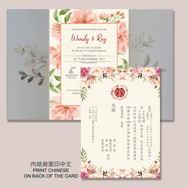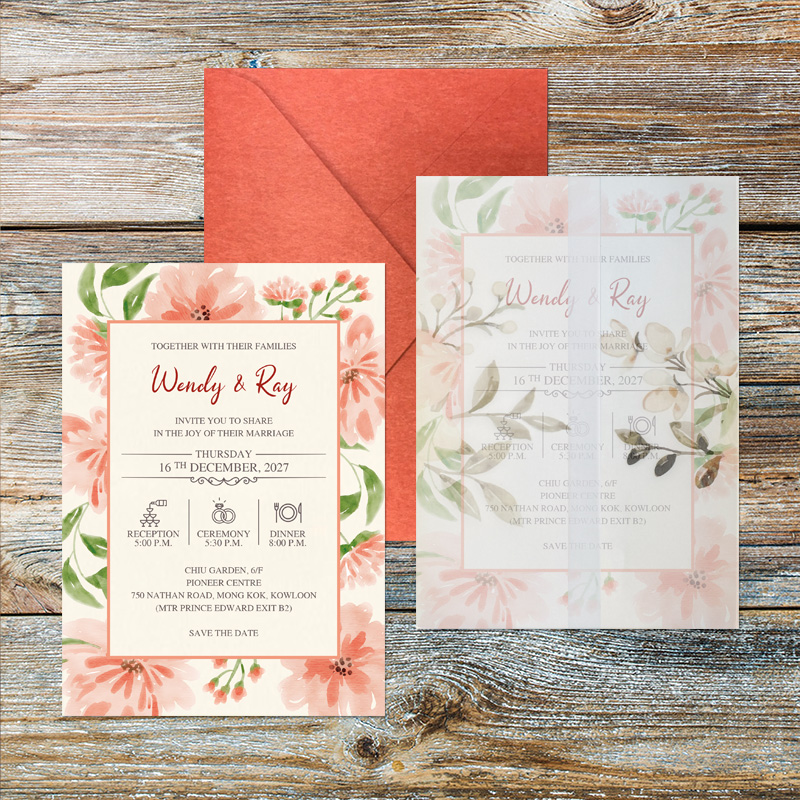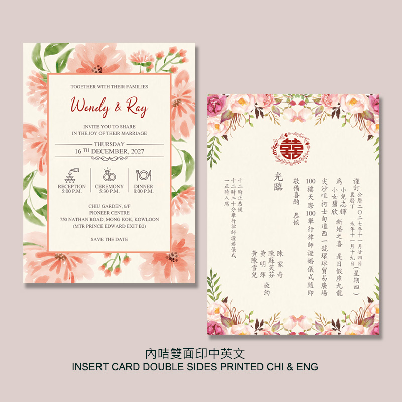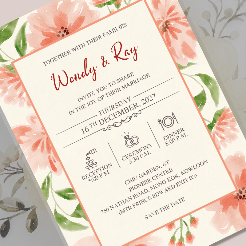 大部份請柬的內文、用紙、用色和字款可按照您的喜愛來改動,但須注意其中有部份選項須另加收費。