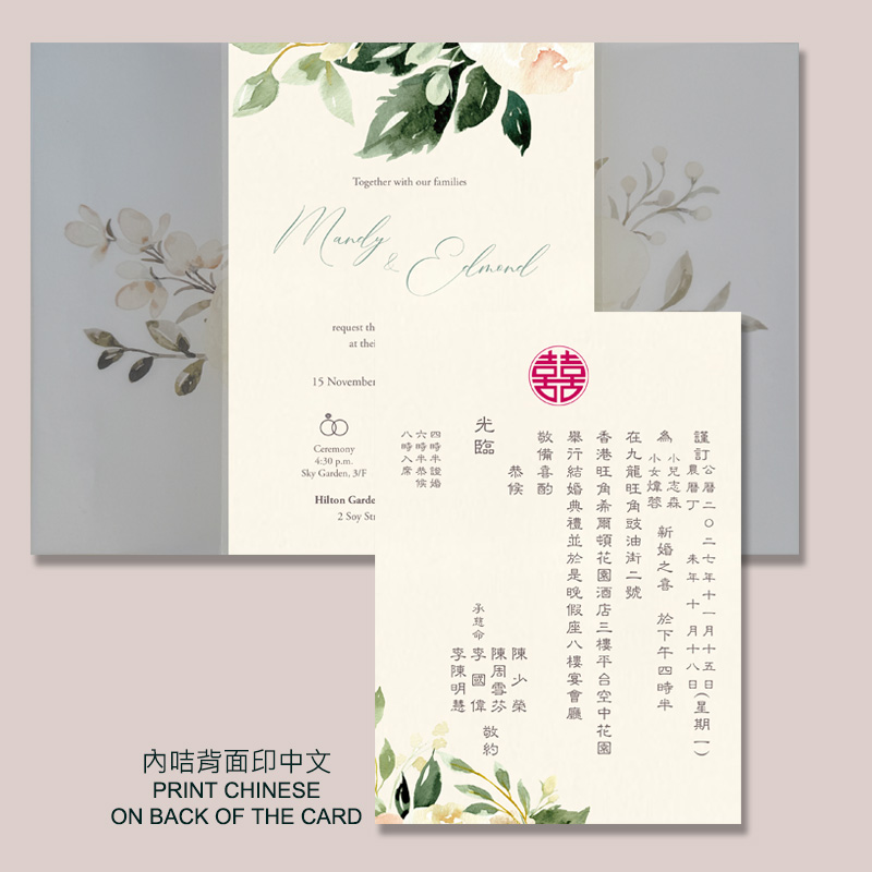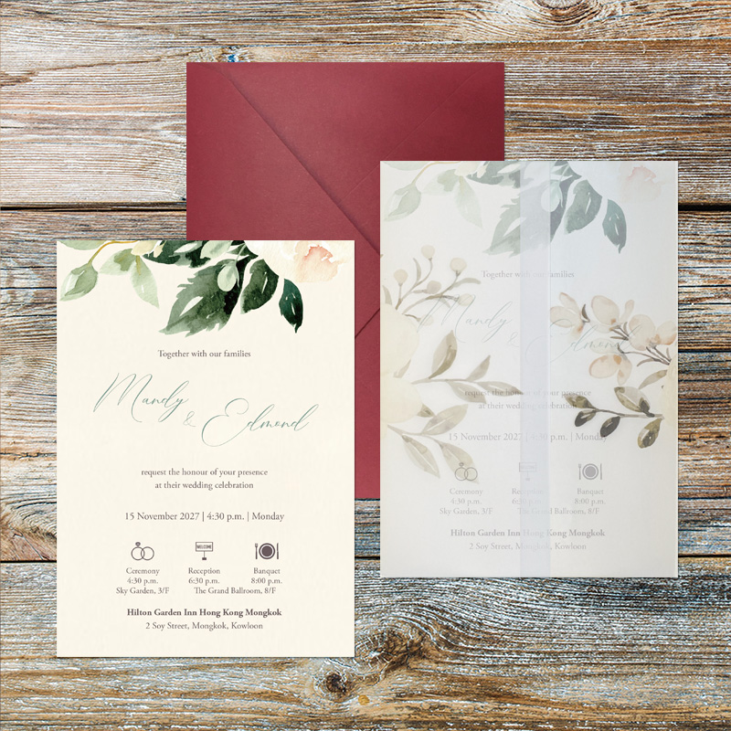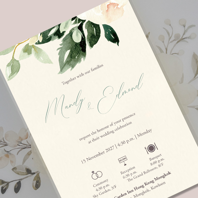 大部份請柬的內文、用紙、用色和字款可按照您的喜愛來改動,但須注意其中有部份選項須另加收費。