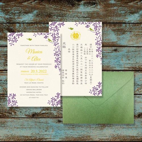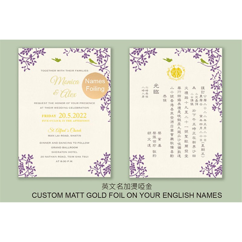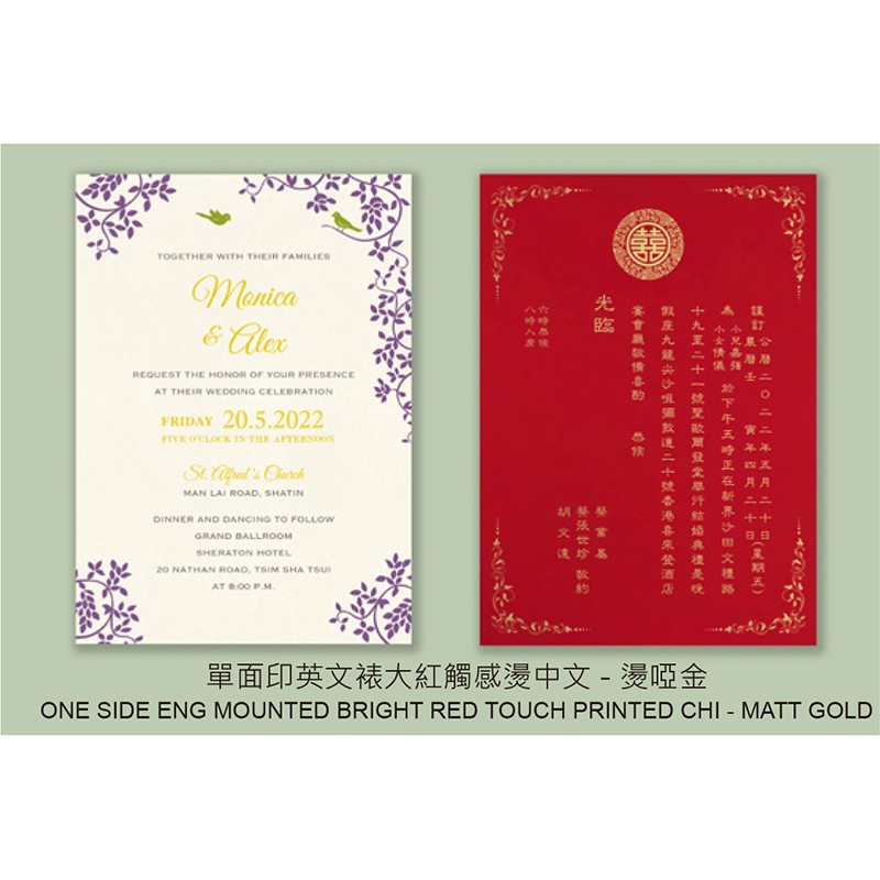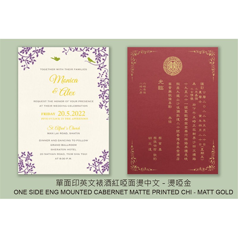 大部份請柬的內文、用紙、用色和字款可按照您的喜愛來改動,但須注意其中有部份選項須另加收費。