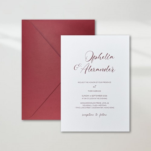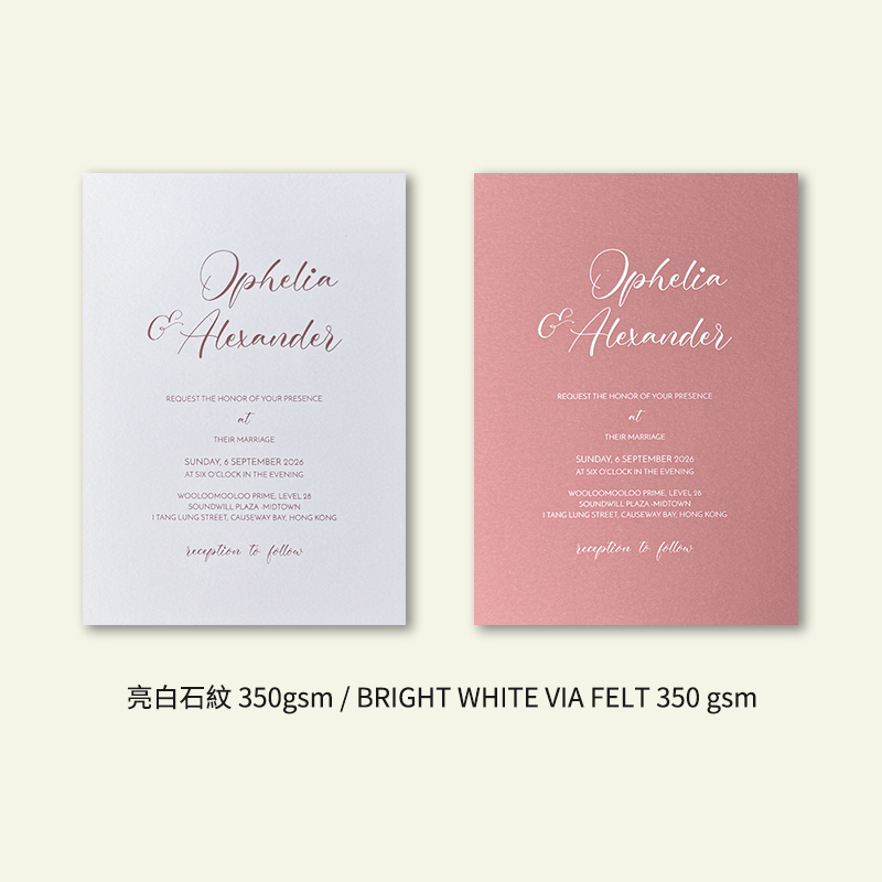 大部份請柬的內文、用紙、用色和字款可按照您的喜愛來改動,但須注意其中有部份選項須另加收費。