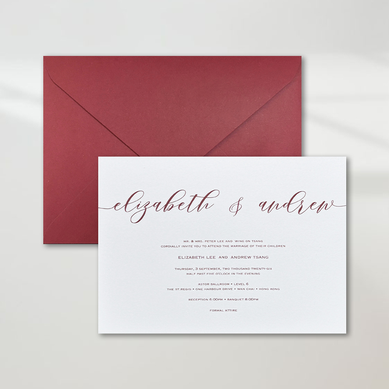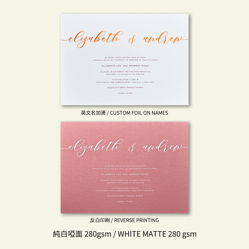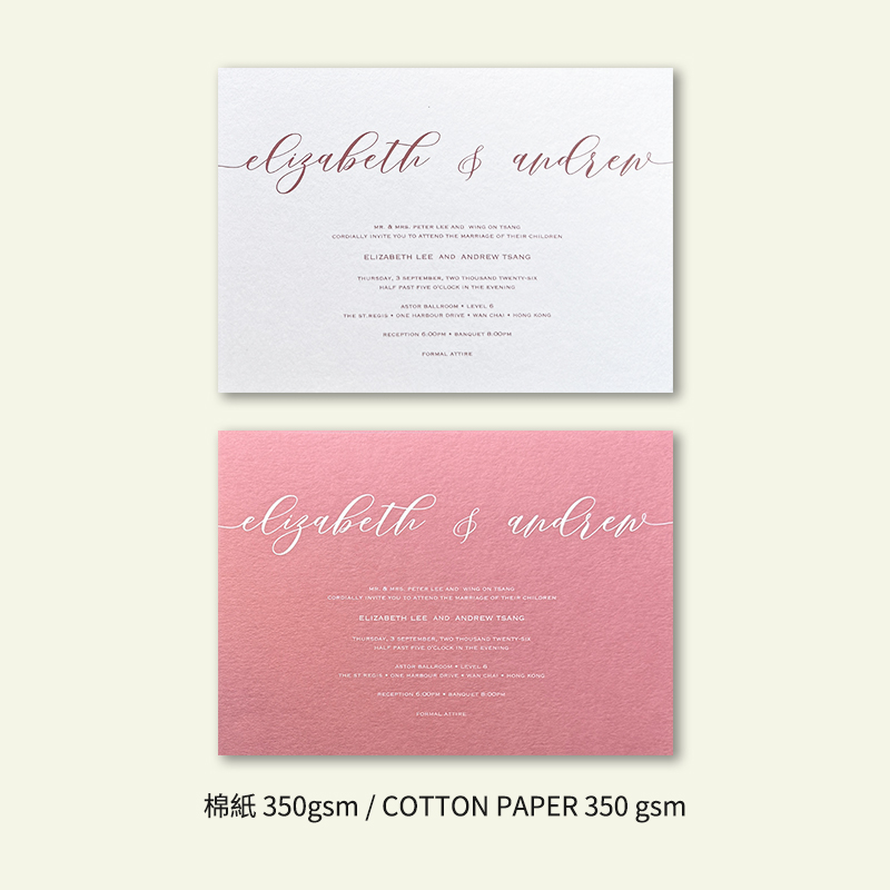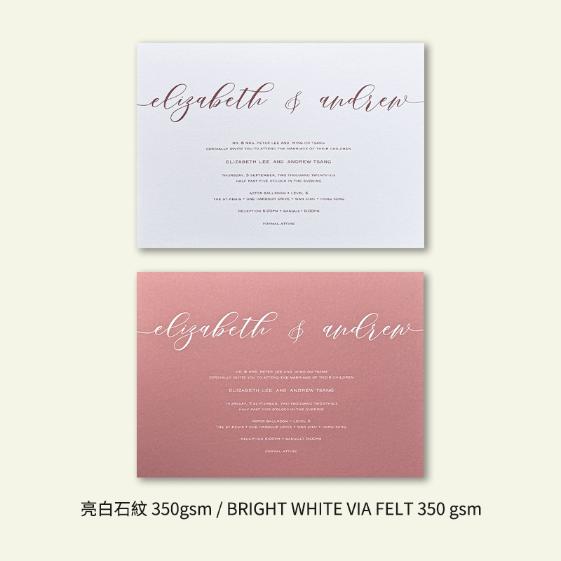 大部份請柬的內文、用紙、用色和字款可按照您的喜愛來改動,但須注意其中有部份選項須另加收費。