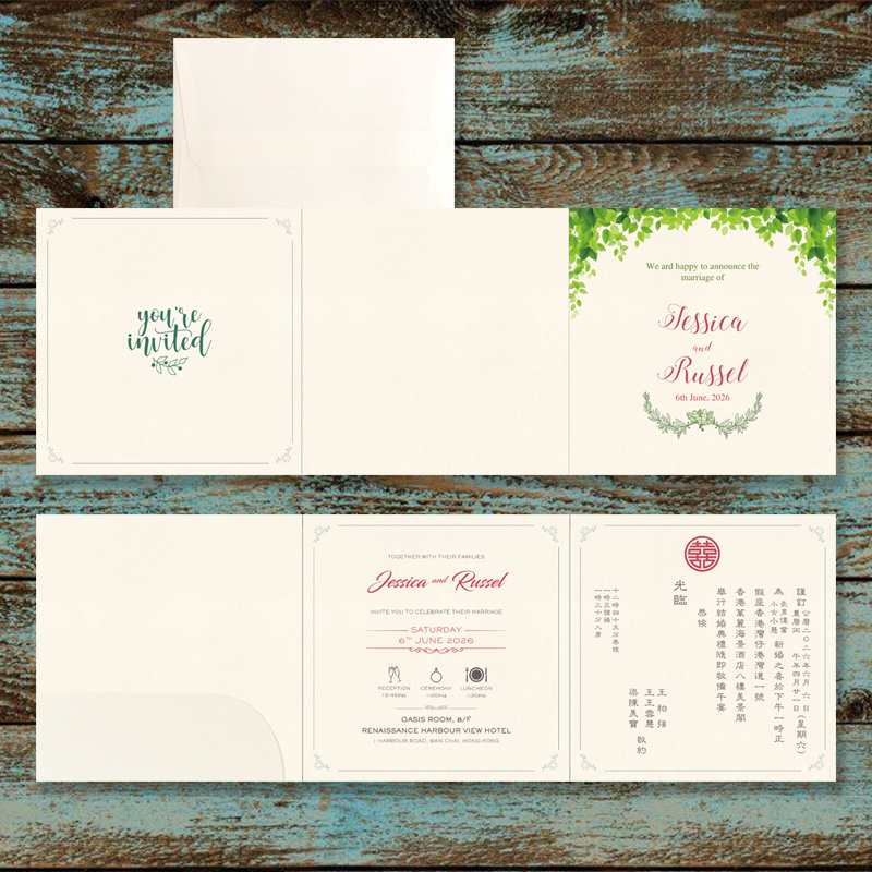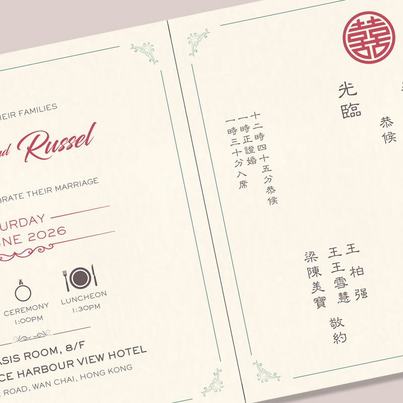 大部份請柬的內文、用紙、用色和字款可按照您的喜愛來改動,但須注意其中有部份選項須另加收費。
