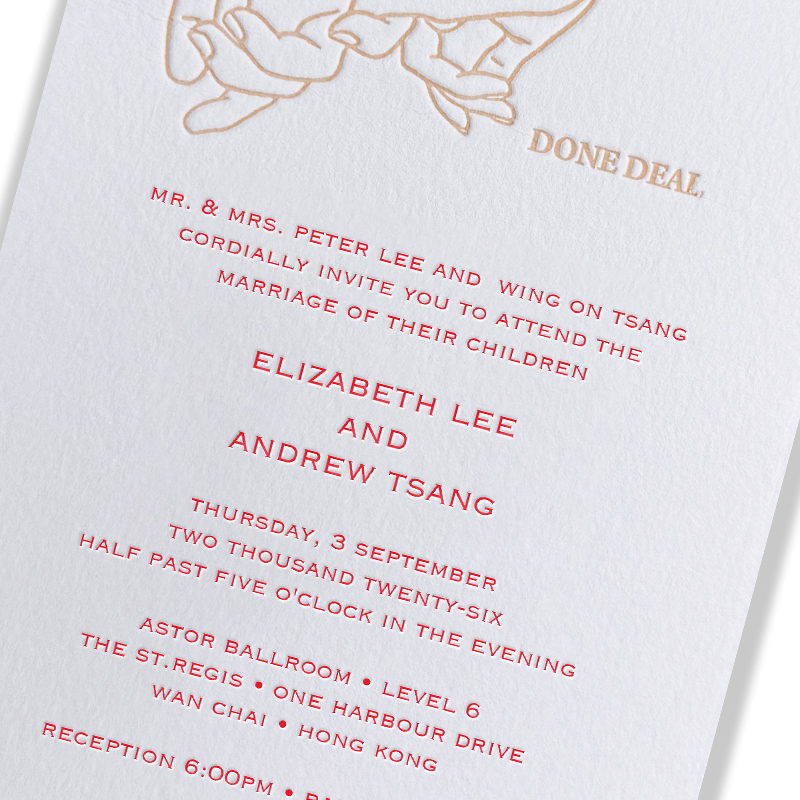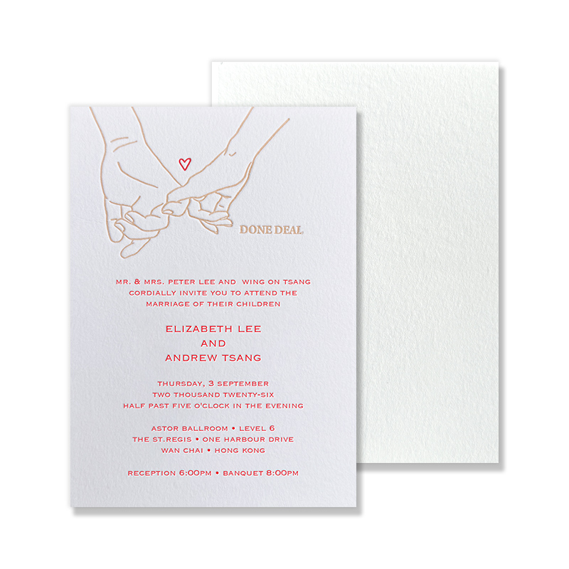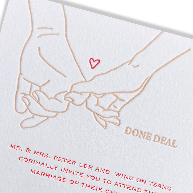 網站上請柬由內文、紙張、印色到字體都可以按照您的喜愛來改動。凸版印刷通常使用專色印製,為準確描述,我們會使用 Pantone 色彩來描述,你也可提供你喜愛 Pantone 色彩給我們