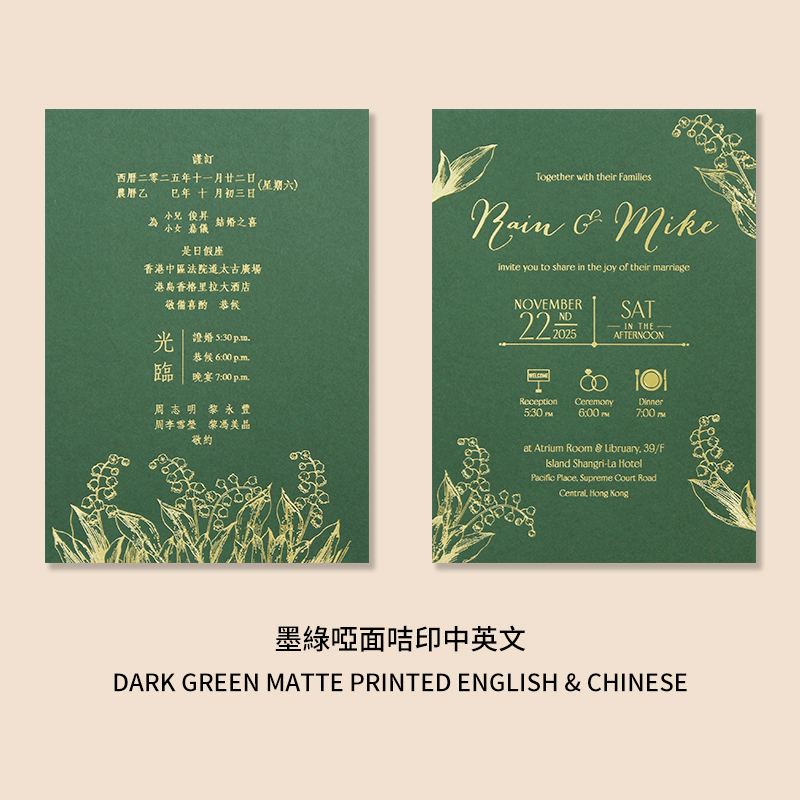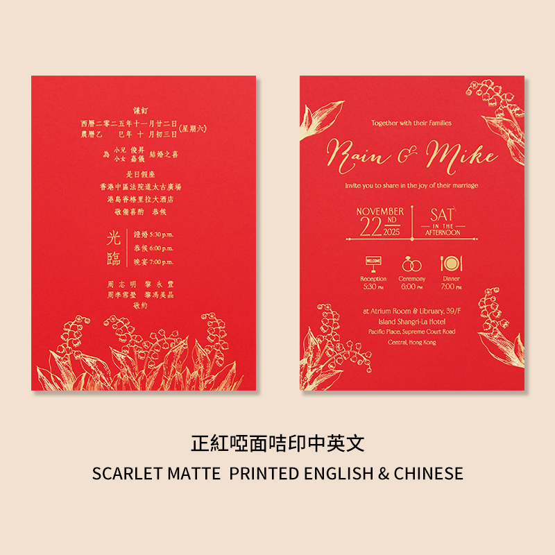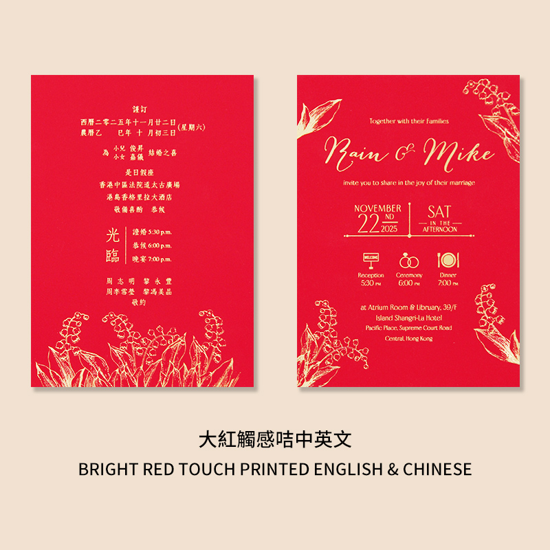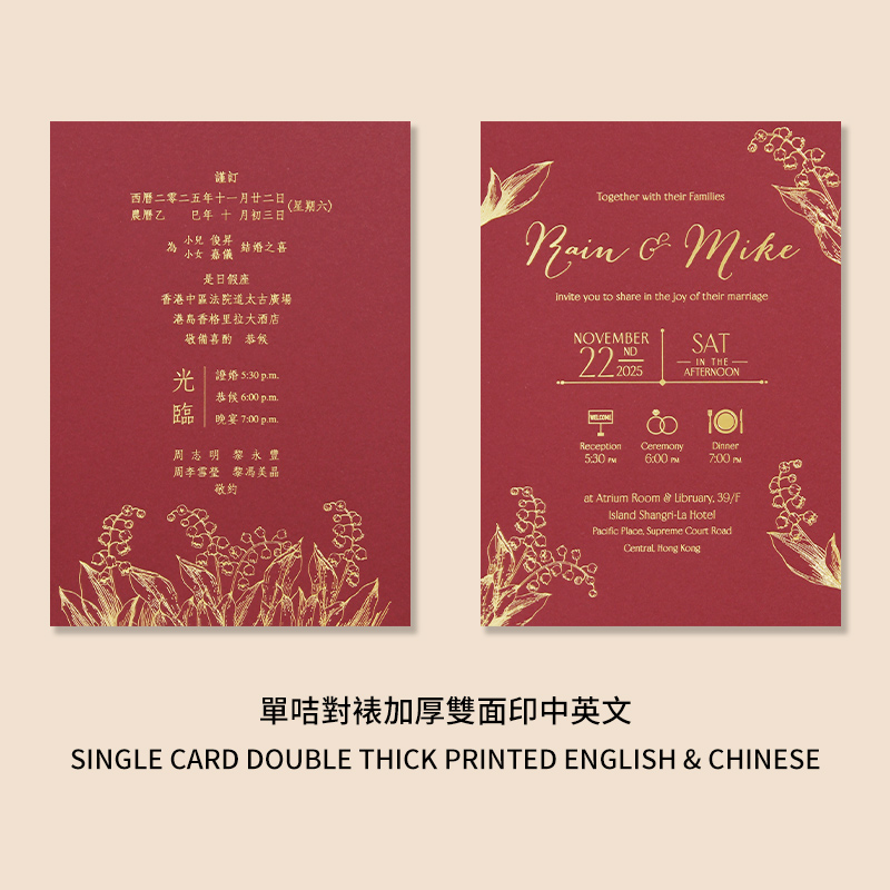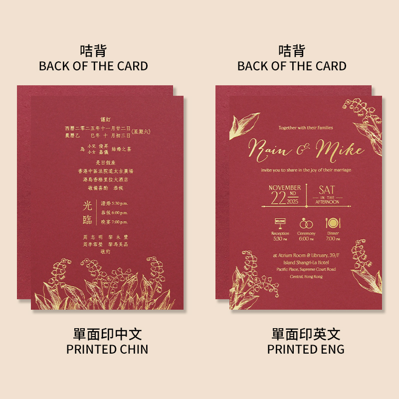 大部份請柬的內文、用紙、用色和字款可按照您的喜愛來改動,但須注意其中有部份選項須另加收費。