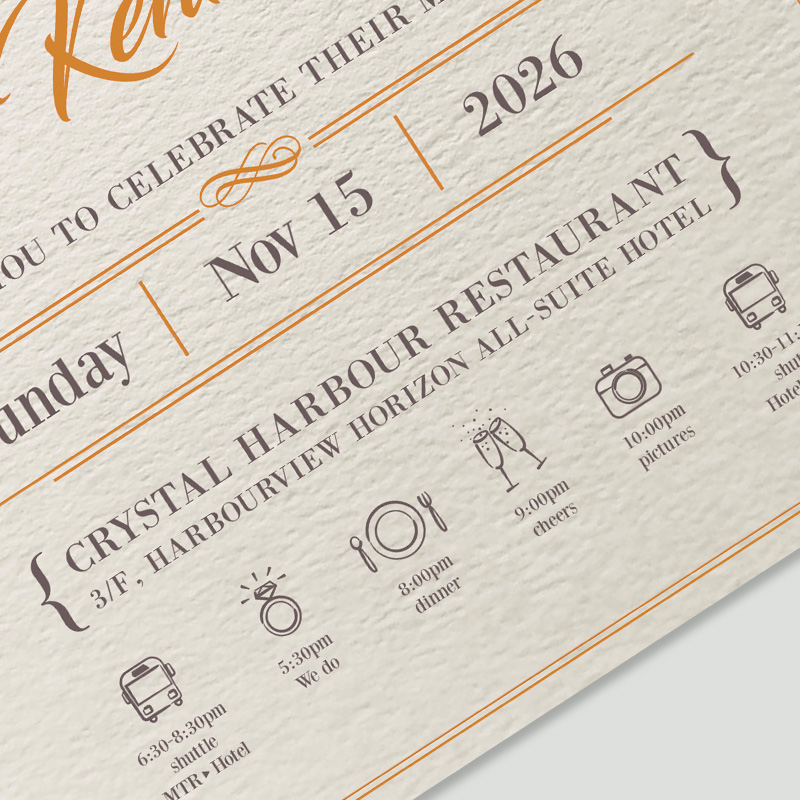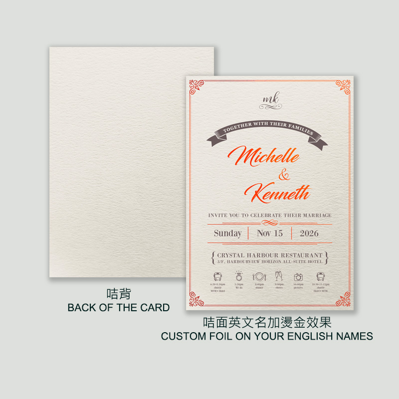 大部份請柬的內文、用紙、用色和字款可按照您的喜愛來改動,但須注意其中有部份選項須另加收費。