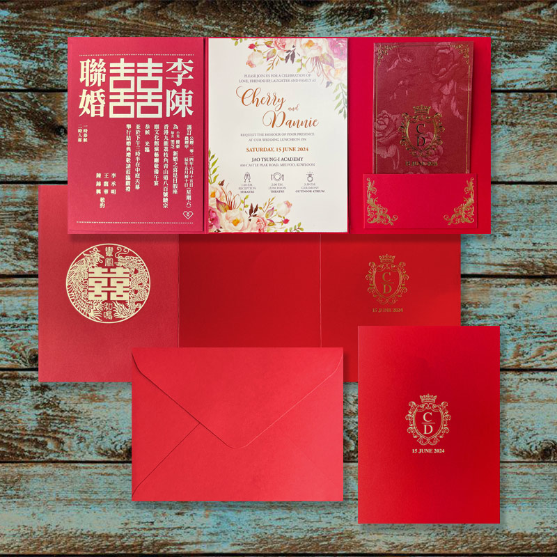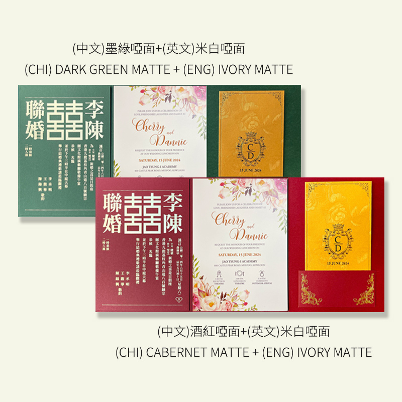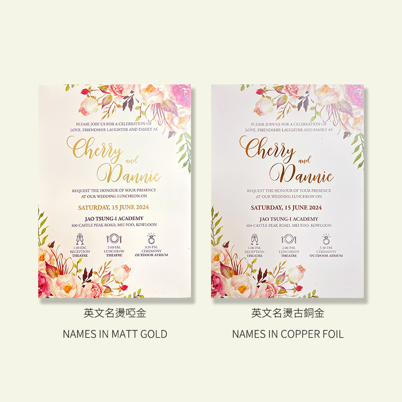 大部份請柬的內文、用紙、用色和字款可按照您的喜愛來改動,但須注意其中有部份選項須另加收費。
