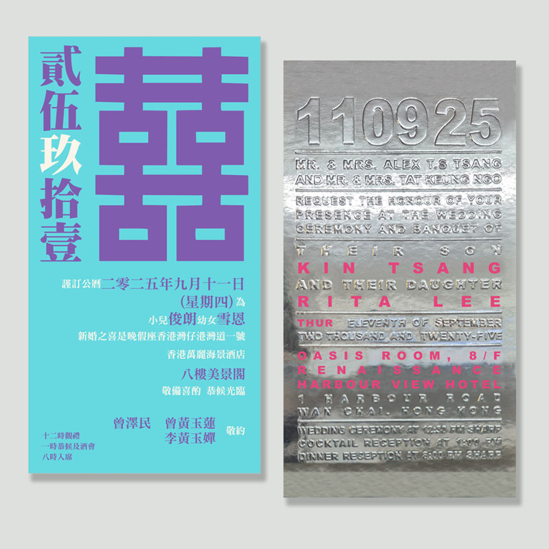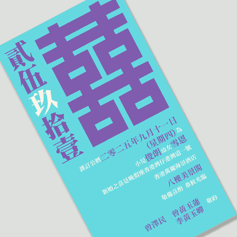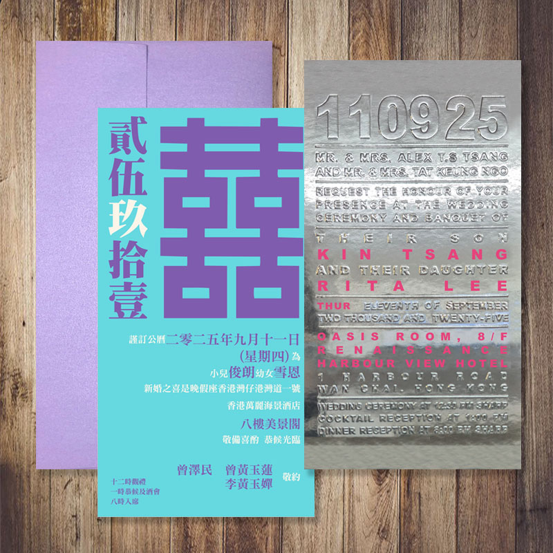 大部份請柬的內文、用紙、用色和字款可按照您的喜愛來改動,但須注意其中有部份選項須另加收費。